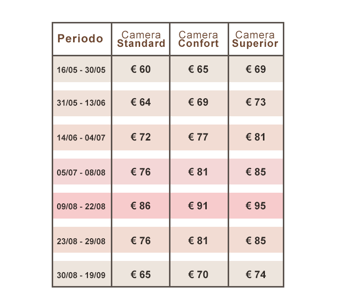 Ai prezzi sopra indicati, per il periodo 15.06 - 31.08, va aggiunta l'imposta di soggiorno pari ad € 2,00 per ogni persona adulta per 5 giorni.
